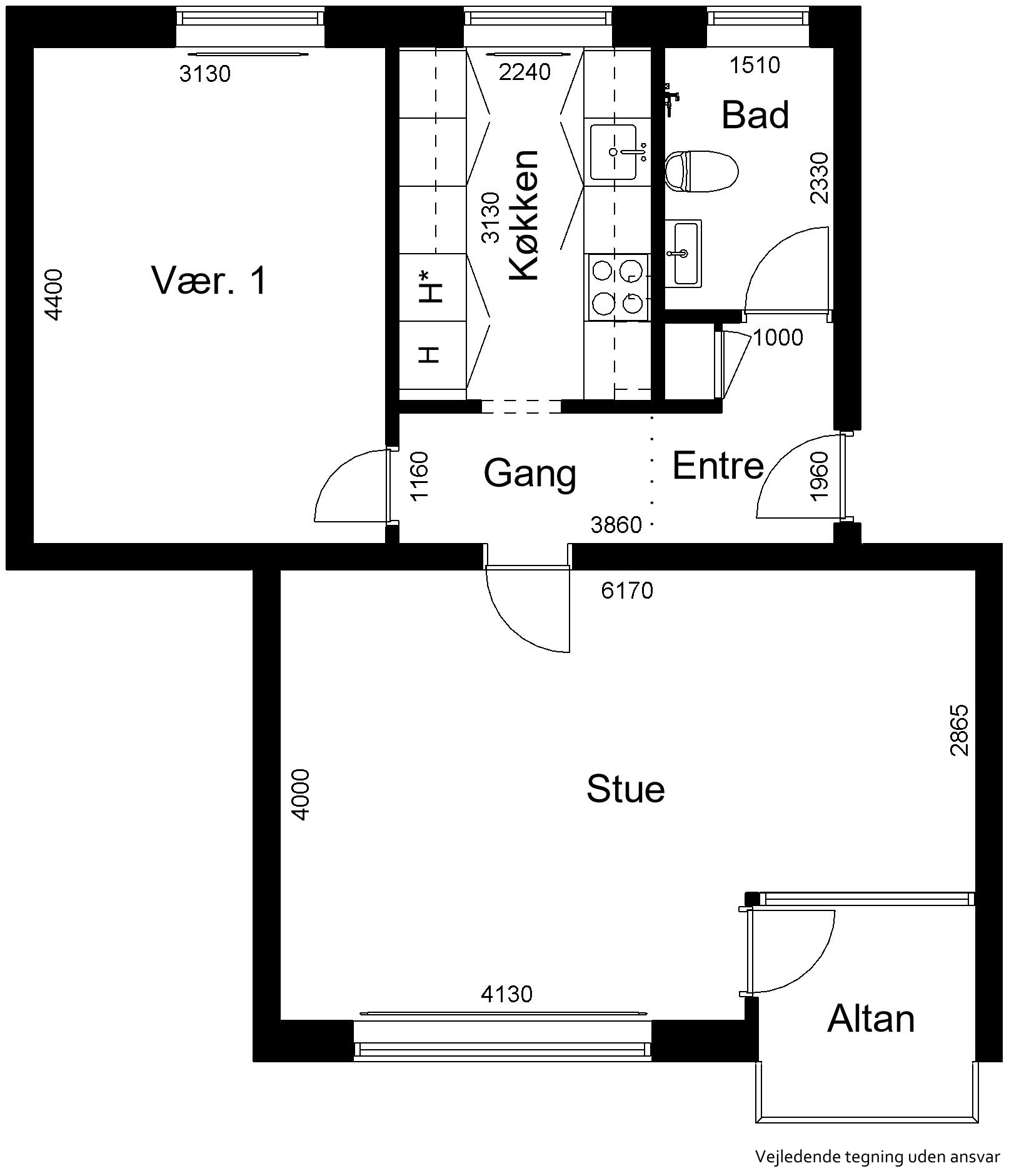 Emfang, komfur og køleskab. I stedet for køleskab er der køle-fryseskab til lejlighederne Nørremarksvej 20-48