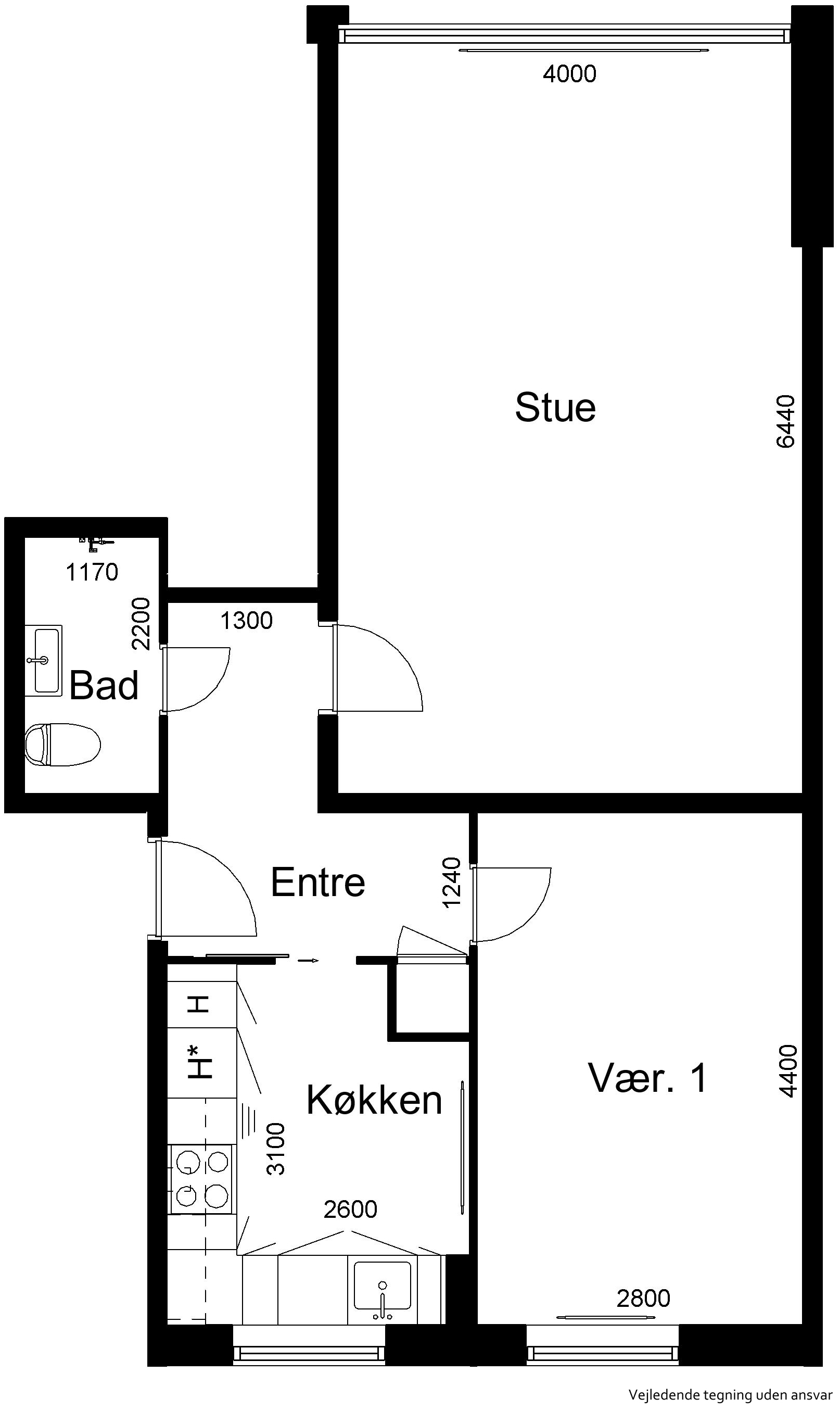 Emfang, komfur og køleskab. I stedet for køleskab er der køle-fryseskab til lejlighederne Nørremarksvej 20-48
